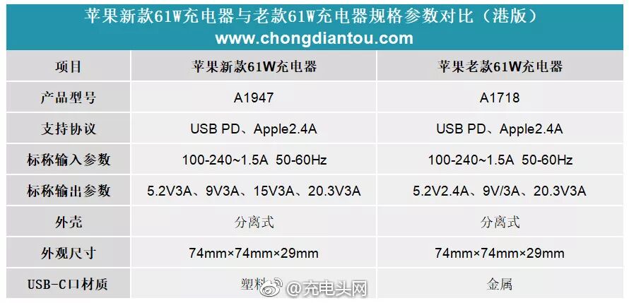 2018年7月,苹果发布了新款笔记本电脑——MacBook Pro 2018版本。随机附带的充电器是一个61W苹果充电器(A1947)。此前,苹果就有一款61W的充电器(A1718),为了探知新款61W充电器与旧款61W充电器之间的区别,充电头网分别拿新旧两款充电器(两款充电器都是港版)做了一个对比。如下: