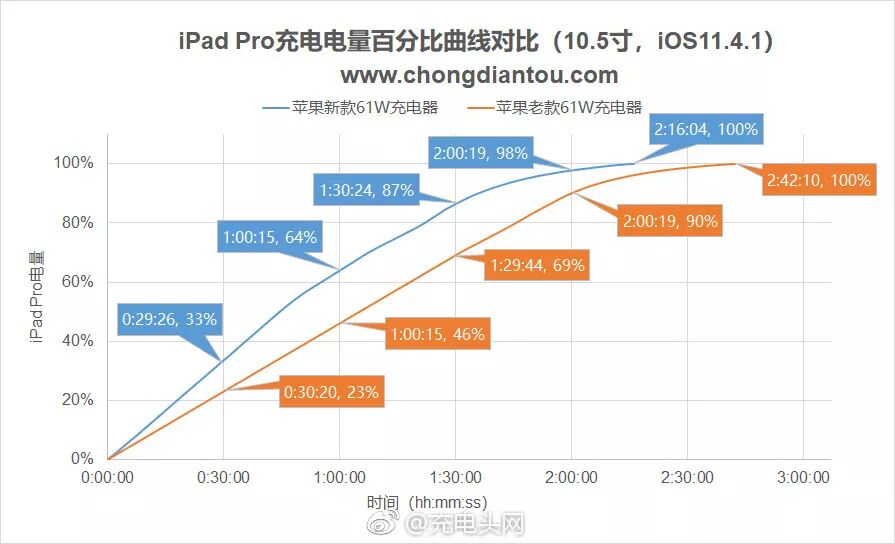 苹果新款61W充电器(A1947)的速度是:33%电量/0.5小时、64%电量/1小时、87%电量/1.5小时、98%电量/2小时,完全充满需要2小时16分钟;苹果老款61W充电器(A1718)的速度是:23%电量/0.5小时、46%电量/1小时、69%电量/1.5小时、90%电量/2小时,完全充满需要2小时42分钟,新款充iPad Pro比旧款充iPad Pro快了差不多半小时。