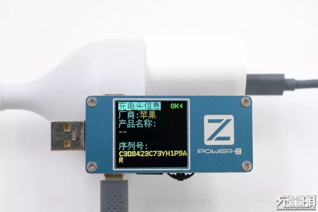 使用ChargerLAB研发的POWER-Z FL001S USB测试仪读取充电头信息,正确读出序列号,序列号为:C3D8423C73YH1P9AR,与充电器外壳标注一致。