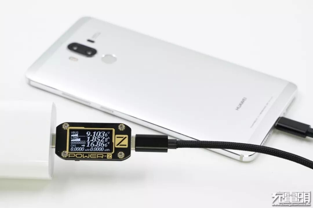 充华为Mate9(电量2%),电压9.1V,电流1.85A,功率16.86W,快充开启。