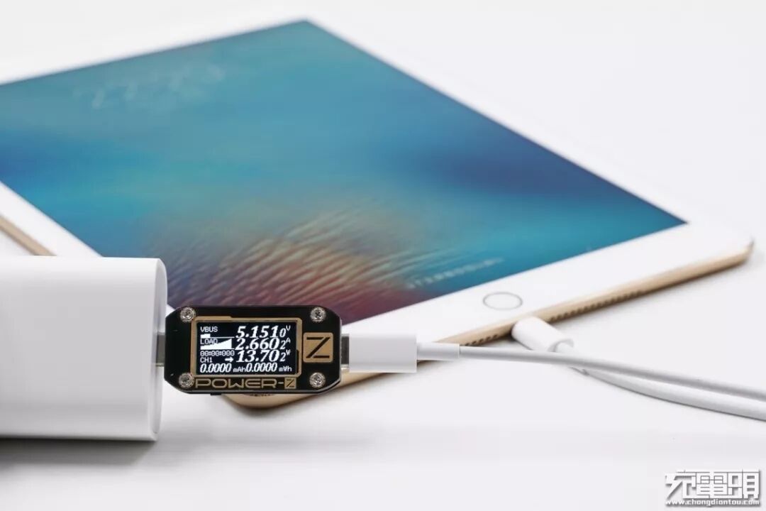 iPad Air2不具备USB PD快充,充iPad Air2(电量8%)时,电压5.15V,电流2.66A,功率13.7W。