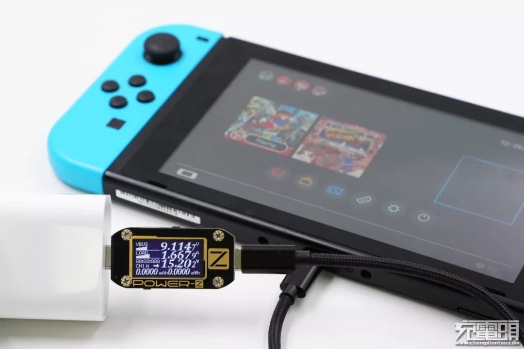充Switch游戏机(电量23%),电压9.11V,电流1.66A,功率15.2W,快充开启。