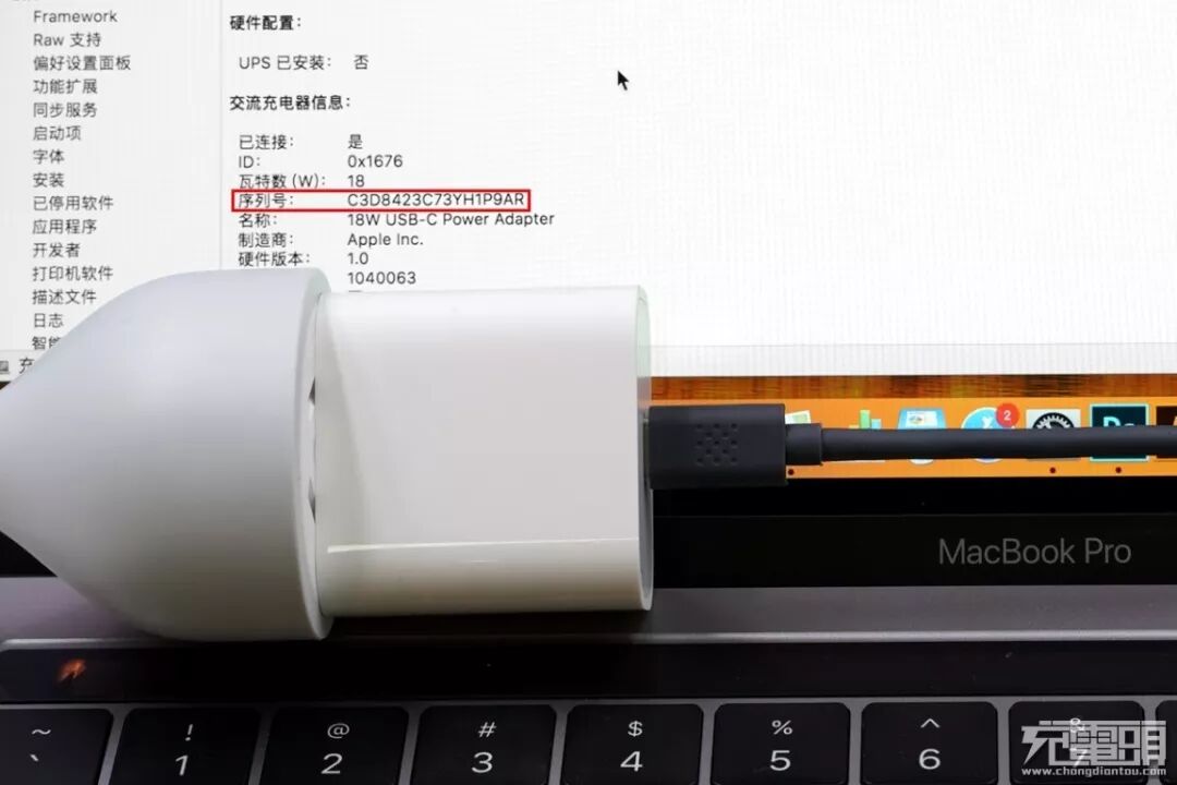 日常使用中,用苹果iPad 18W PD充电器给MacBook Pro充电,在关于本机→系统报告→电源→交流充电器信息内读取到充电器的序列号。可以看到交流充电器信息内的序列号为:C3D8423C73YH1P9AR,与充电器外壳标注一致。