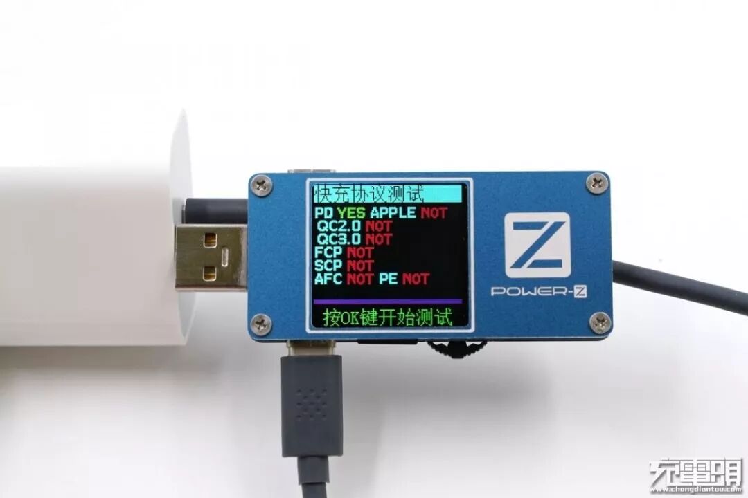通过ChargerLAB的POWER-Z FL001S快充协议测试,发现仅支持USB PD快充协议;而Apple 2.4A、QC2.0、QC3.0、FCP、SCP等快充协议均不支持。
