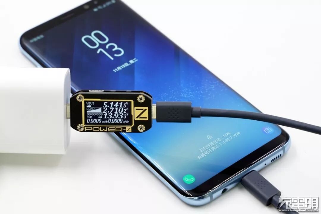 充三星S8+(电量55%)使用的是5V PD快充档位,电压5.14V,电流2.71A,功率13.93W,快充开启。