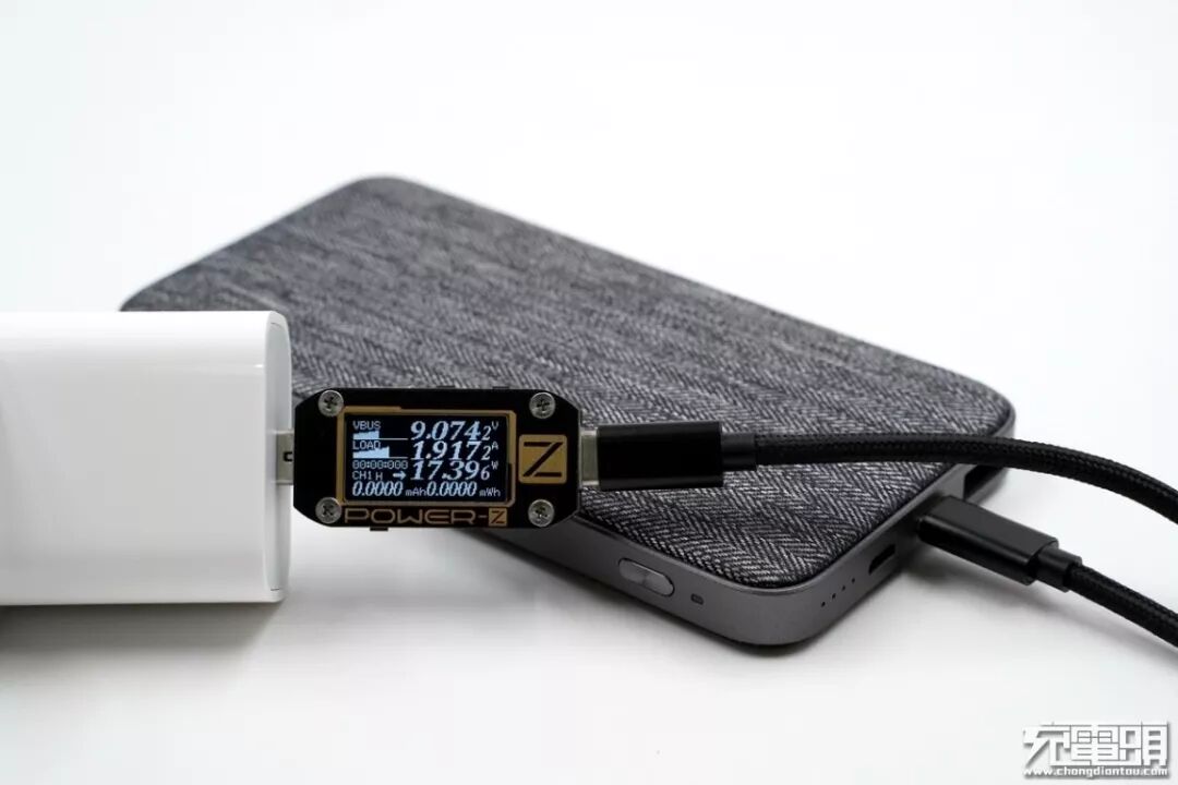 充紫米QB910移动电源,容量10000mAh,电量2/4 LED,电压9.07V,电流1.91A,功率17.39W,快充开启。