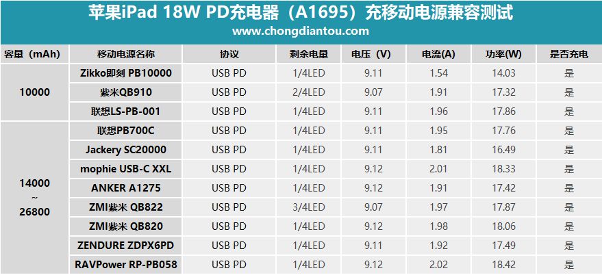 全部移动电源兼容性做成了表格,方便大家观看。