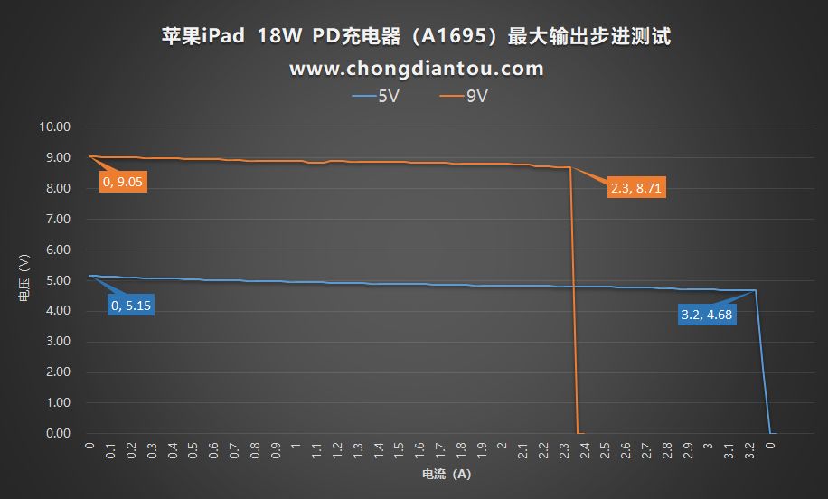 小编分别对苹果iPad 18W PD充电器的5V输出档和9V输出档位进行步进测试,如图所示,5V档位最大输出电流为3.2A,最大输出功率为14.97W;9V档位最大输出电流为2.3A,最大输出功率为20.03W,充电器有2W余量。