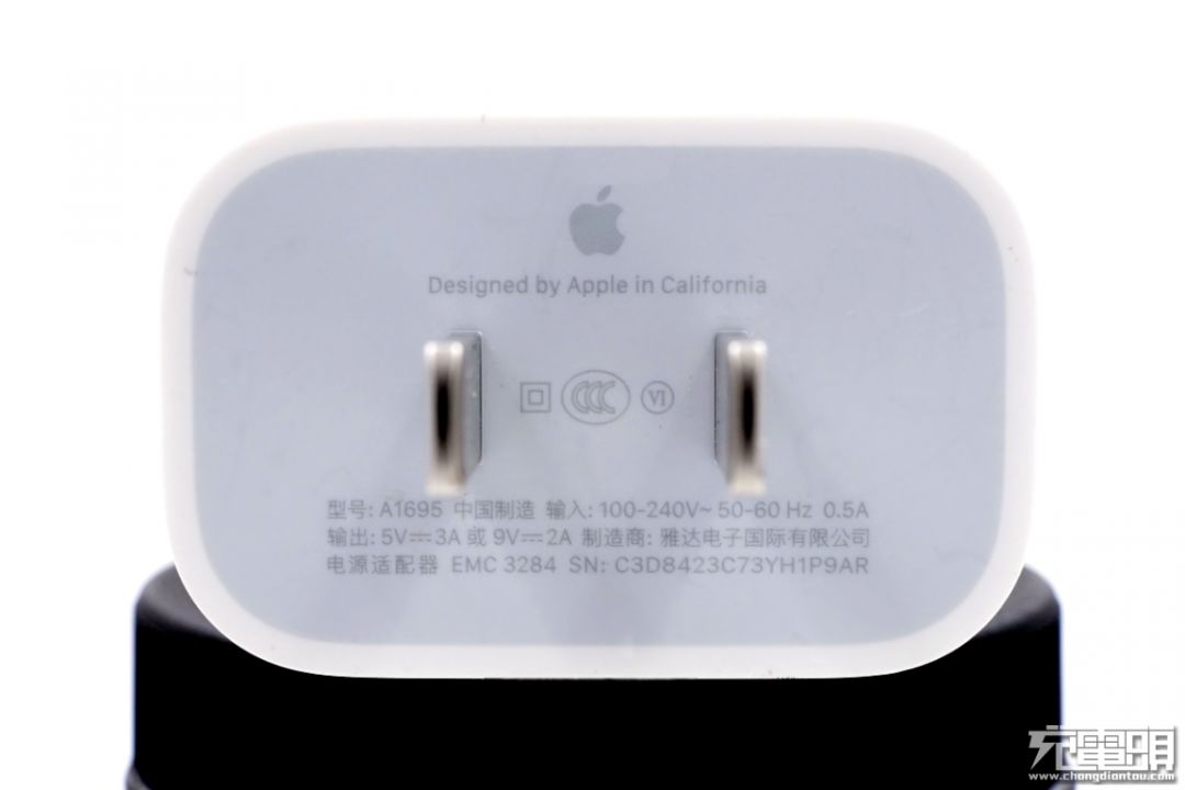 苹果iPad 18W PD充电器底部铭牌信息:100-240V 50/60Hz 0.5A输入,5V/3A、9V/2A输出,制造商为雅达电子国际有限公司,SN:C3D8423C73YH1P9AR。