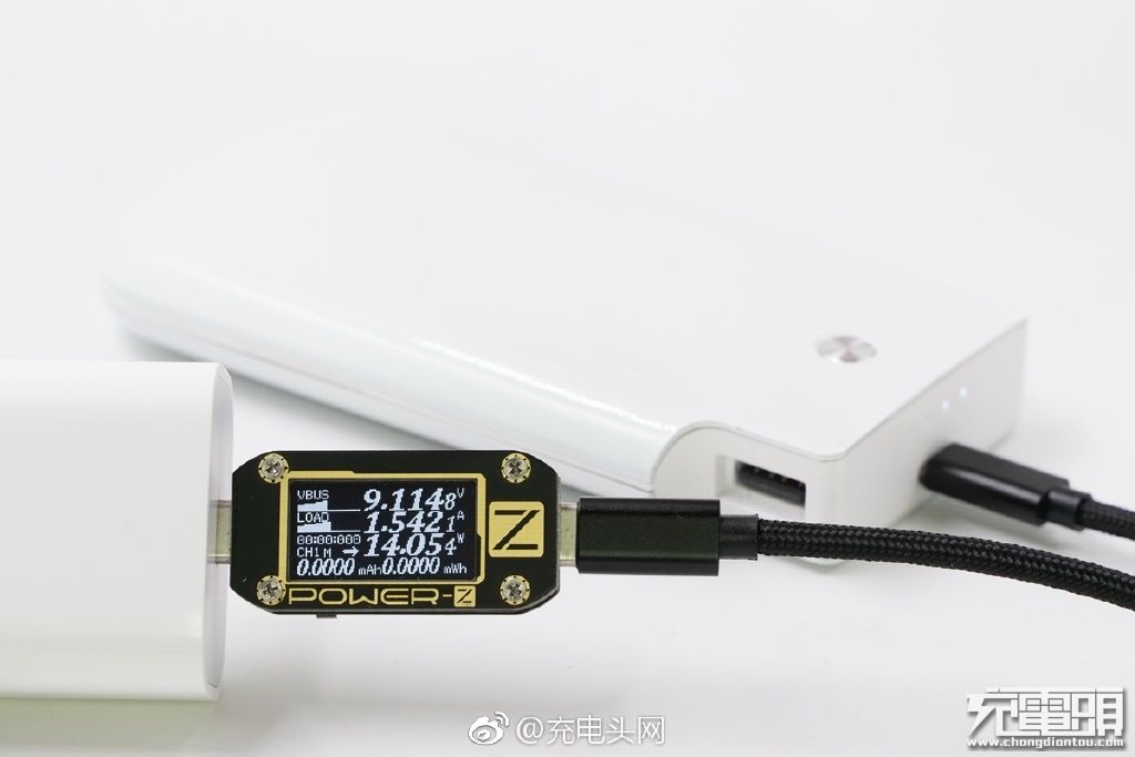 充Zikko PB10000移动电源,容量10000mAh,电量2/4 LED,电压9.11V,电流1.54A,功率14.05W,快充开启。