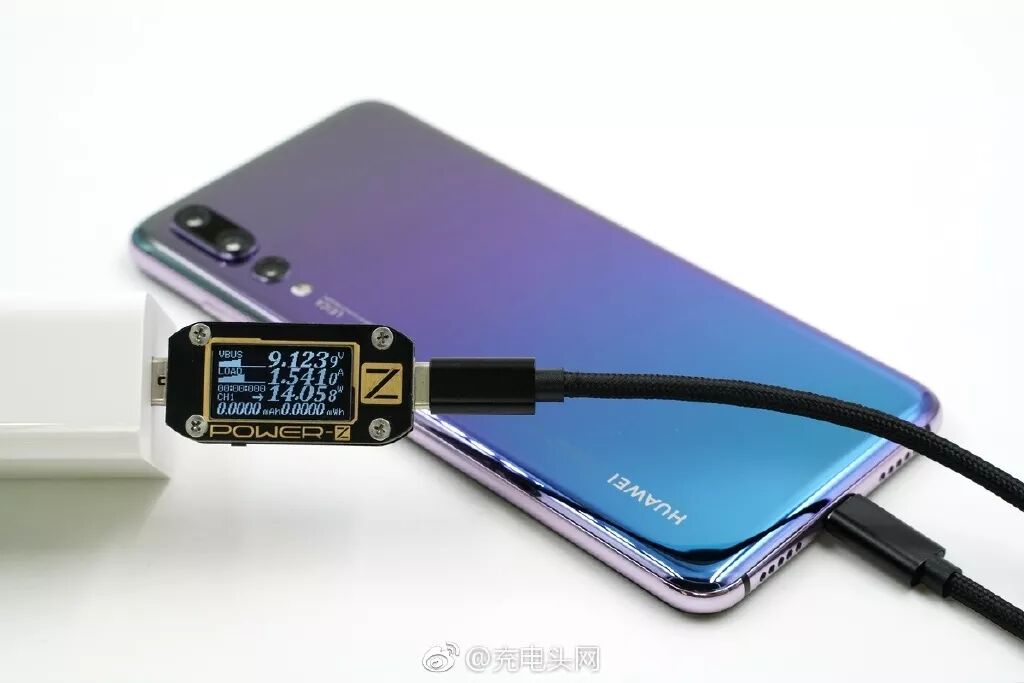 给华为P20 Pro充电,电压9.12V,电流1.54A,功率14.05W,快充开启。
