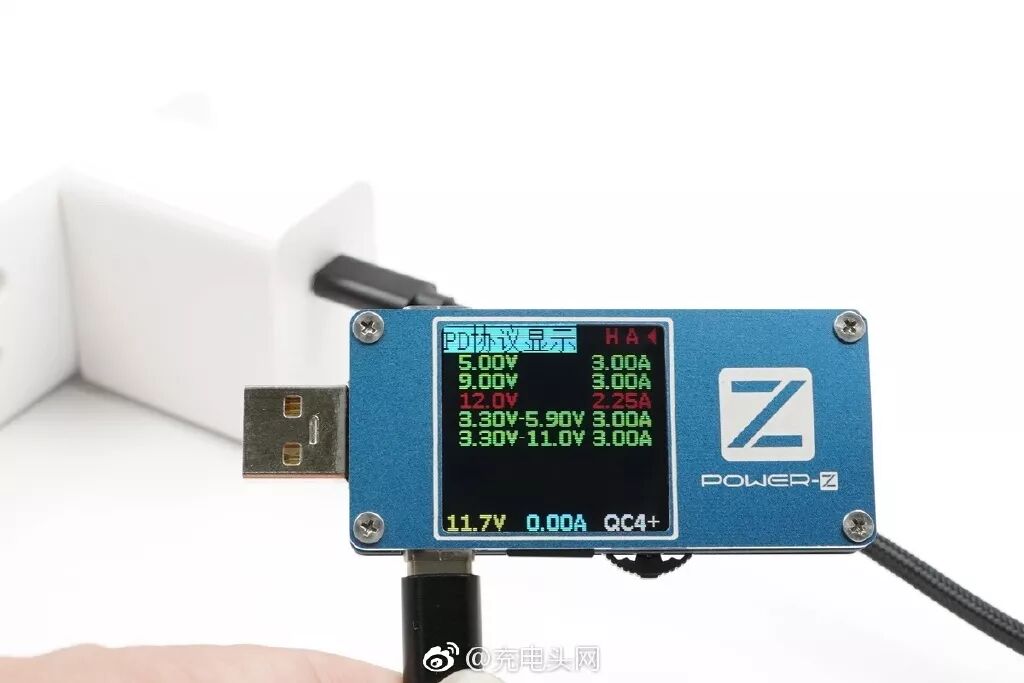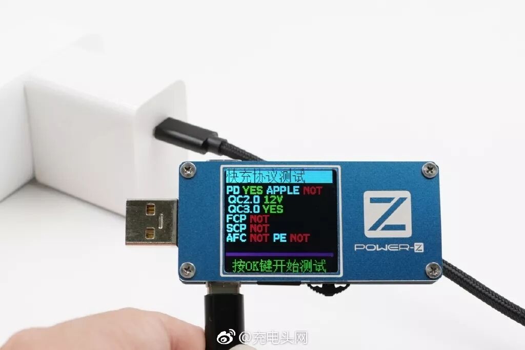 使用POWER-Z FL001S测得支持USB PD、QC2.0、QC3.0三种协议。