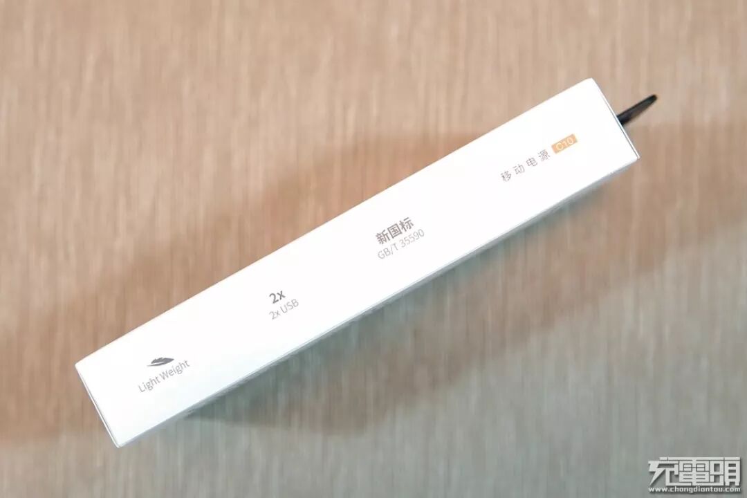 侧面简要标明了移动电源的特点:重量轻,带2个USB接口,符合新国标GB/T35590标准。