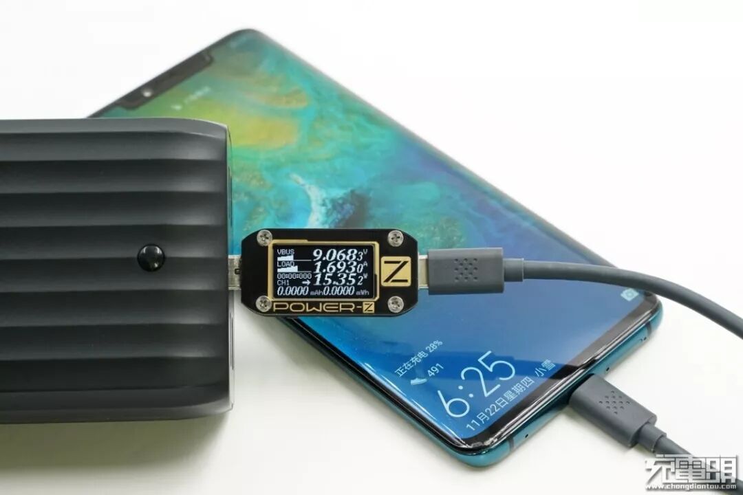Zikko PowerBag移动电源,容量10000mAh,电量2/4LED,USB-C口充华为Mate 20 Pro,电压9.01V,电流1.72A,功率15.58W,PD快充开启。