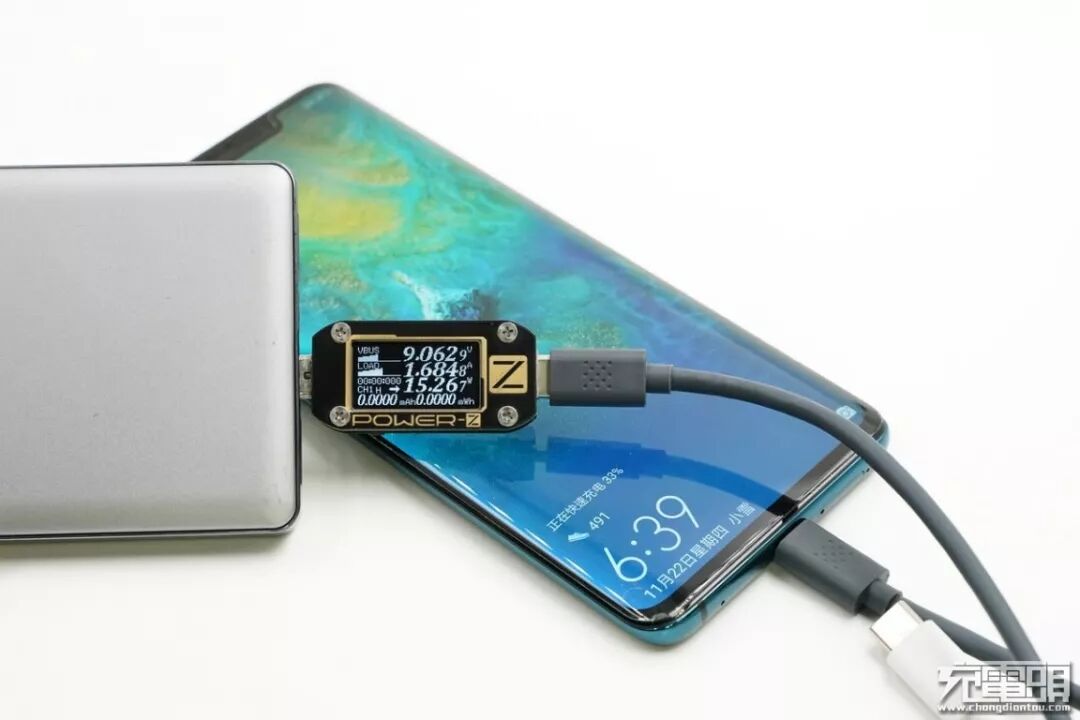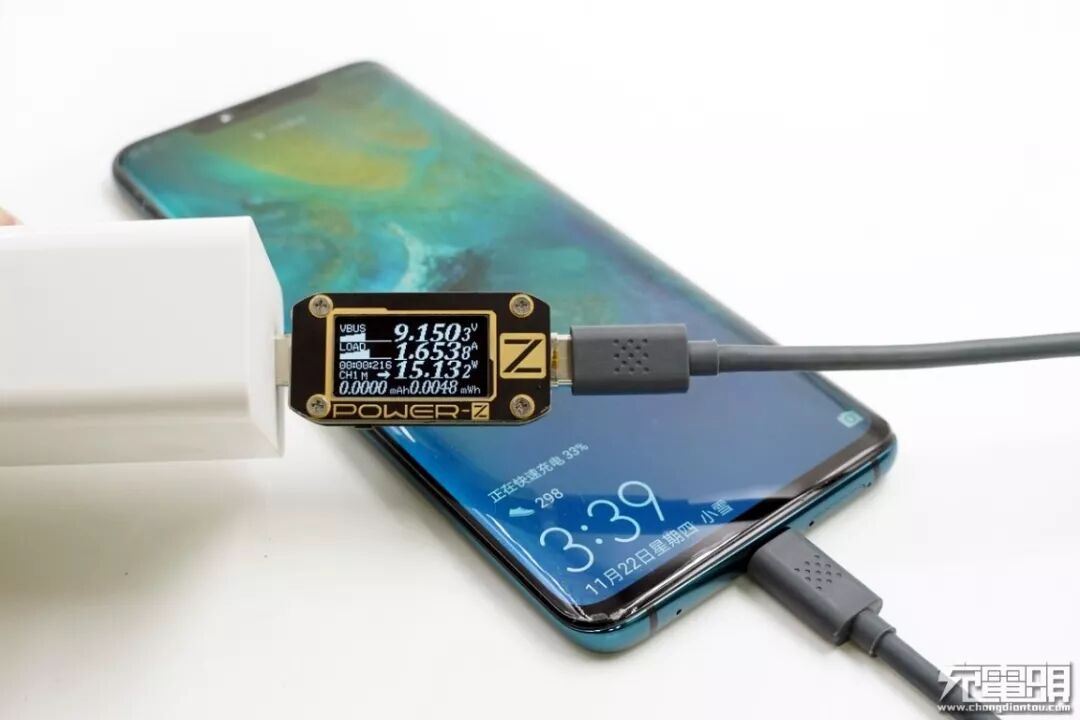 使用华为(HW-200200CP0)40W PD充电器充华为Mate 20 Pro,电压9.15V,电流1.65A,功率15.13W,PD快充开启。