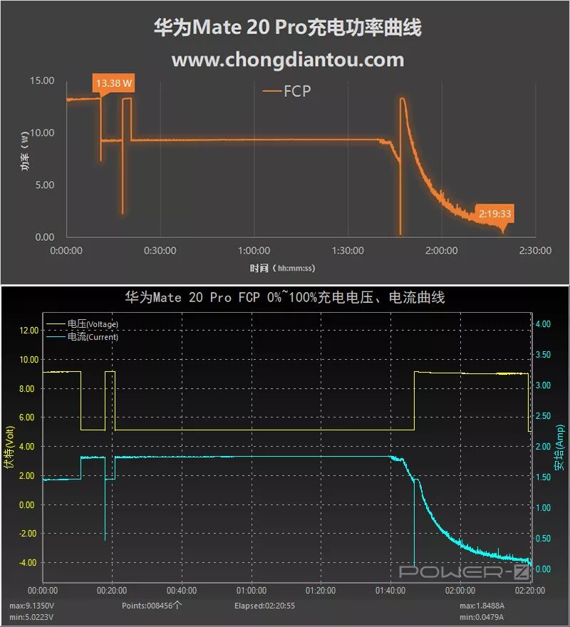 使用荣耀(AP31)车充的USB-A口充华为Mate 20 Pro,FCP快充开启。此次充电的电压、电流、功率曲线变化情况跟PD快充非常相似,手机同样握手9V档位充电,随后大部分时间维持在5V充电,功率9W左右。最高功率出现在10分钟左右,达13.38W,全程充满耗时2小时19分钟。