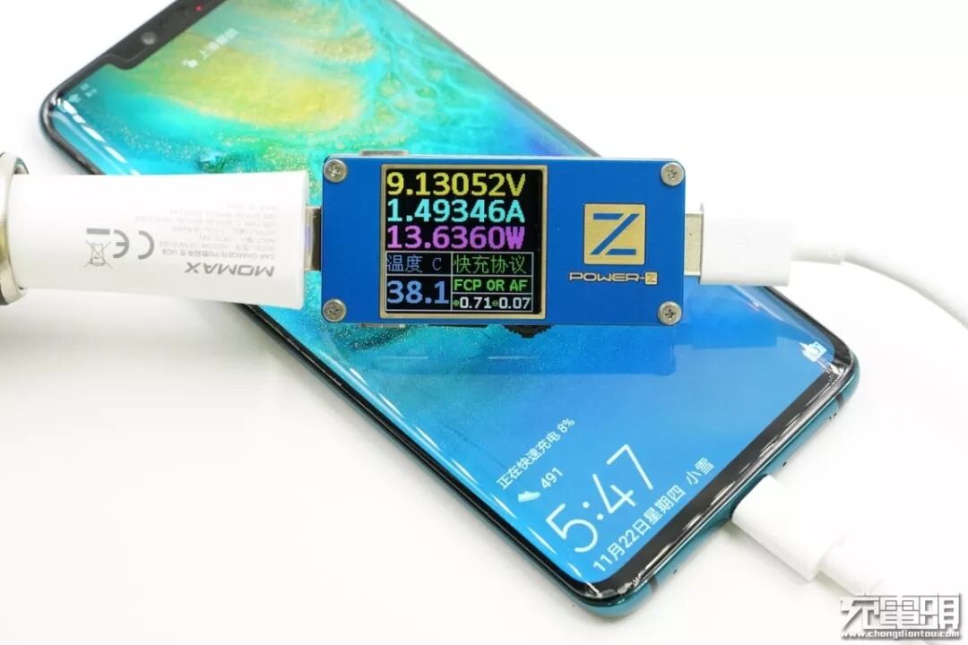 使用MOMAX(ASCC54-P27W12+Q3)车充的USB-A口充华为Mate 20 Pro,电压9.13V,电流1.49A,功率13.69W,FCP快充开启。