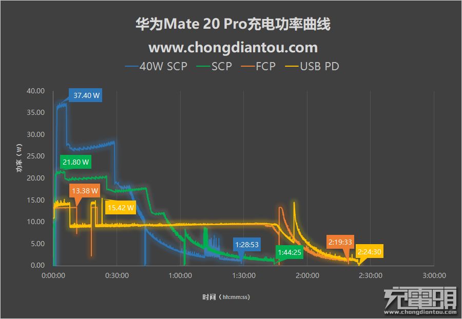 华为Mate 20 Pro支持40W SCP、SCP、FCP、USB PD快充,经过上面的兼容性测试,40W SCP快充功率可以达到37.06W,SCP快充功率能达到17.3W,FCP与USB PD快充功率在13W、15W左右。那么,每个快充的全程充电情况表现将会如何呢?为此小编对每一种快充协议都做了0%~100%的充电测试,结果如下: