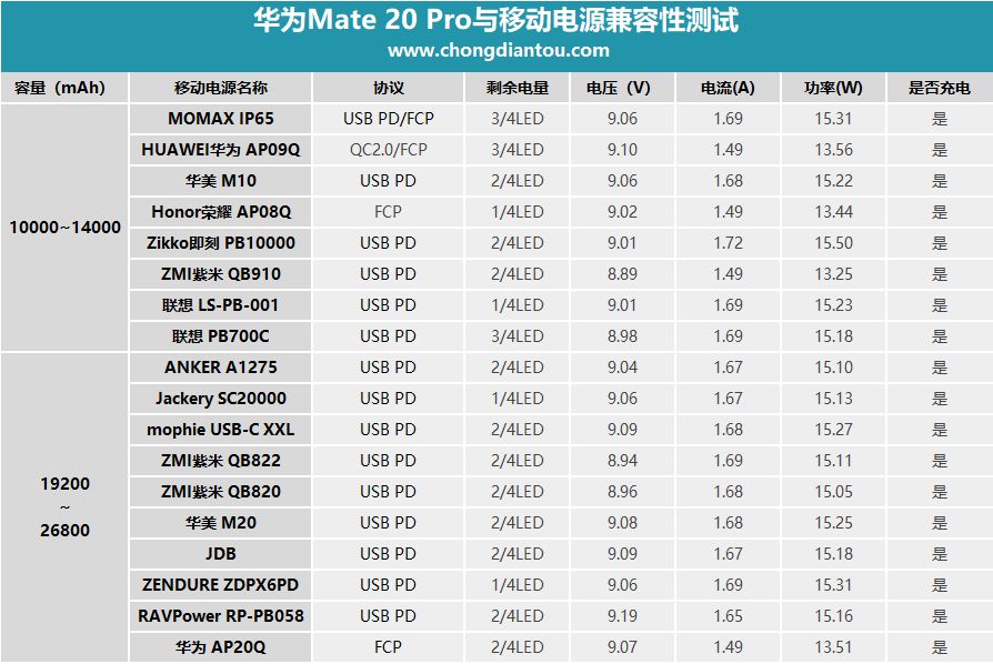 移动电源是生活中的必需品,我们越来越离不开它,如果出门没带移动电源,一整天都会心事重重,如果带了移动电源却发现不能给自己新买的爱机充电,估计会疯掉。下面来测试华为Mate 20 Pro与各品牌移动电源的兼容性,大家可作为选购参考。