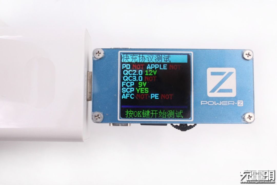 使用ChargerLab POWER-Z FL001S进行协议测试,测得华为HW-100400C00充电器支持QC 2.0、FCP、SCP快充协议。