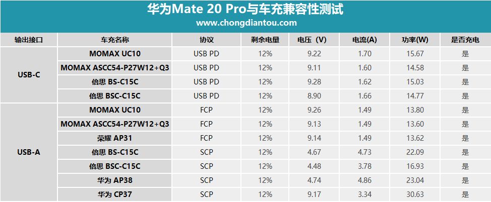 导航软件非常不错,大多数老司机在开车的时候都会开着,避免路线出错,给我们出行带来了方便。但是导航软件是手机内的“电老虎”,开着导航,手机掉电特别快,这就需要一个车充为手机提供续航,尤其是带有快充的车充。市面上车充繁多,兼容性有好有坏,小编挑选了几款常见的车充对华为Mate 20 Pro做了兼容性测试,分为USB-C口和USB-A口两部分,测试结果如下: