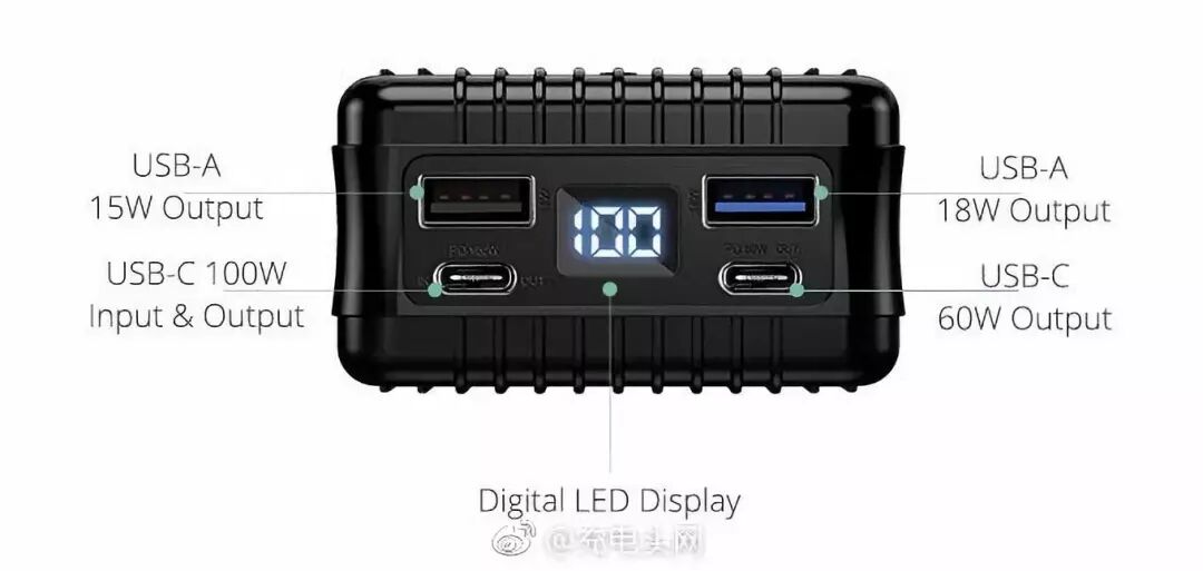 接口与功率,提供有4个USB接口,USB-C口2个,USB-A口2个。其中USB-C口单口可支持高达20V/5A,100W的充放电,性能非常彪悍;另外两个USB-A口其中蓝色胶芯的支持QC快充输出。丰富的接口,可满足多个设备同时供电,兼容笔记本电脑、平板电脑、手机等数码设备。