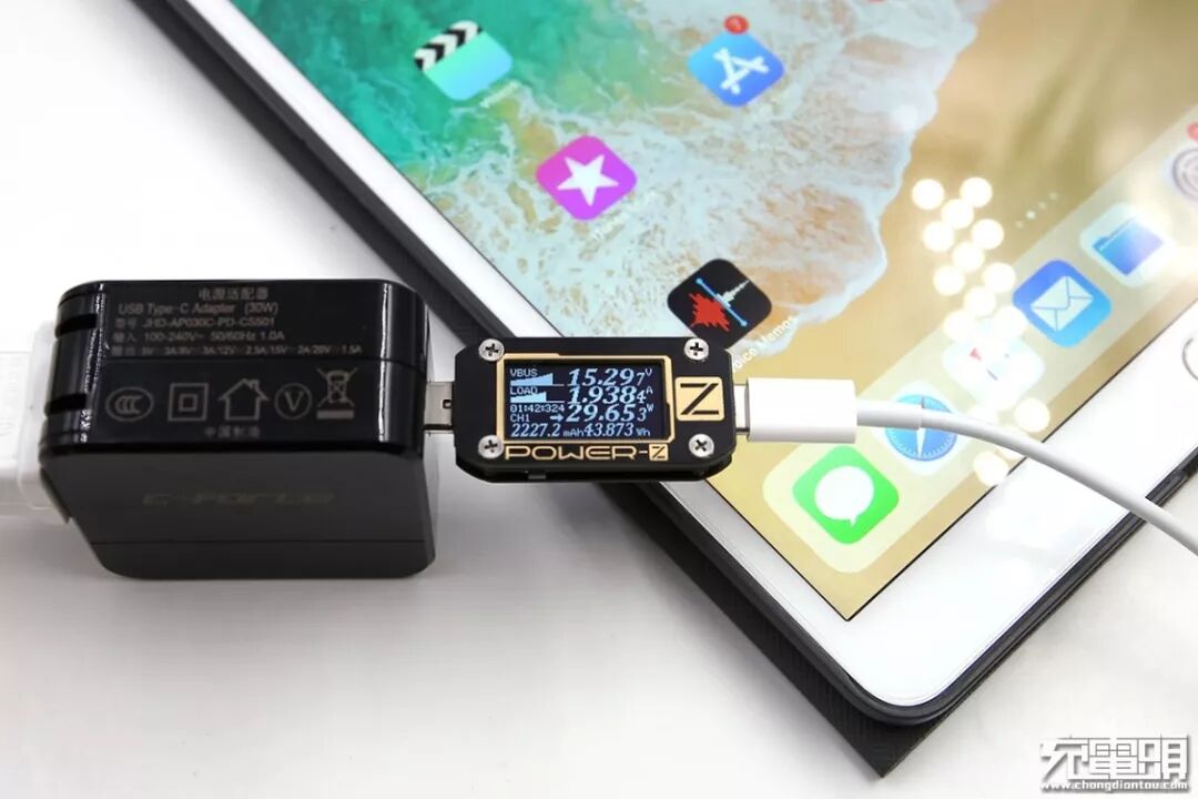 充iPad Pro 10.5英寸,电压15.29V,电流1.93A,功率29.65W,开启PD快充,满载充电。