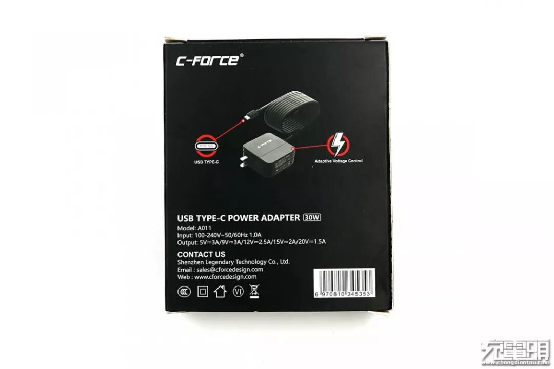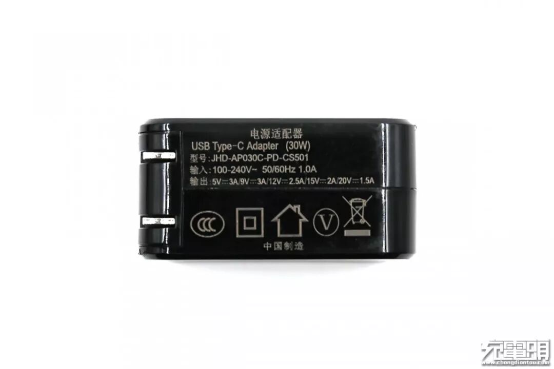 C-FORCE 30W PD充电器的详细参数被印制在顶面,具体为: