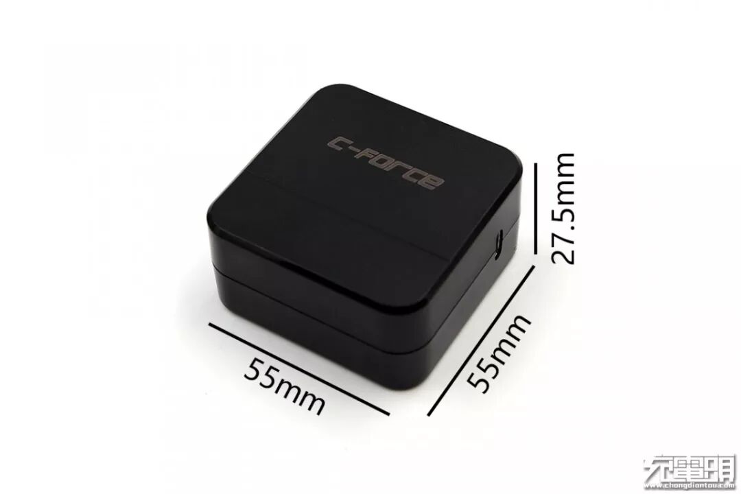 C-FORCE 30W PD充电器黑色塑料外壳为左右拼接盒盖设计,四四方方,正面与背面均有C-FORCE品牌Logo,颜色为灰色。