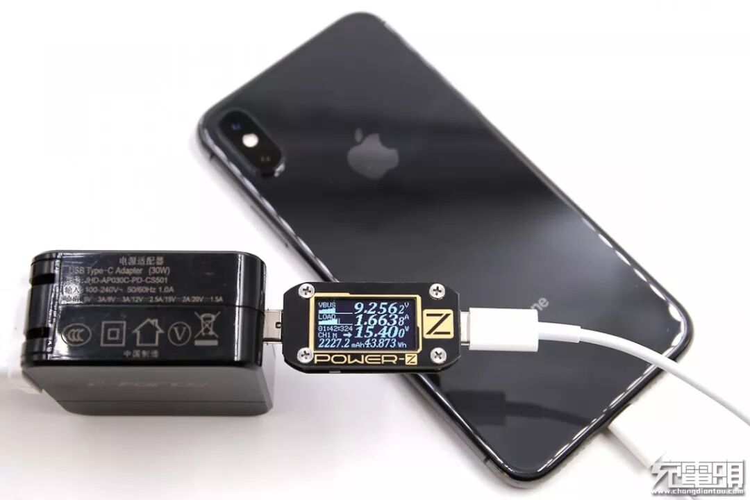 充iPhone XS,电压9.25V,电流1.66A,功率15.4W,开启PD快充。