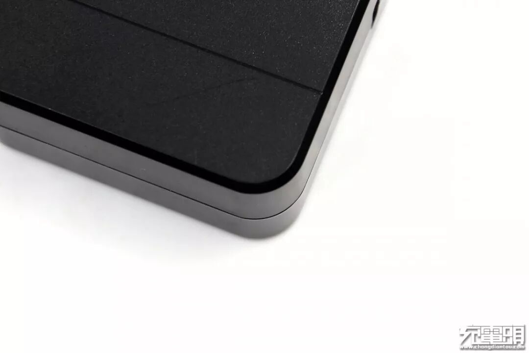 充电器的质感有两种,正面背面为磨砂,侧面腰身为亮面,带来不一样的观感享受,另外还在四周边缘进行了倒角,在握持时有一个缓冲地段,不会磕手。