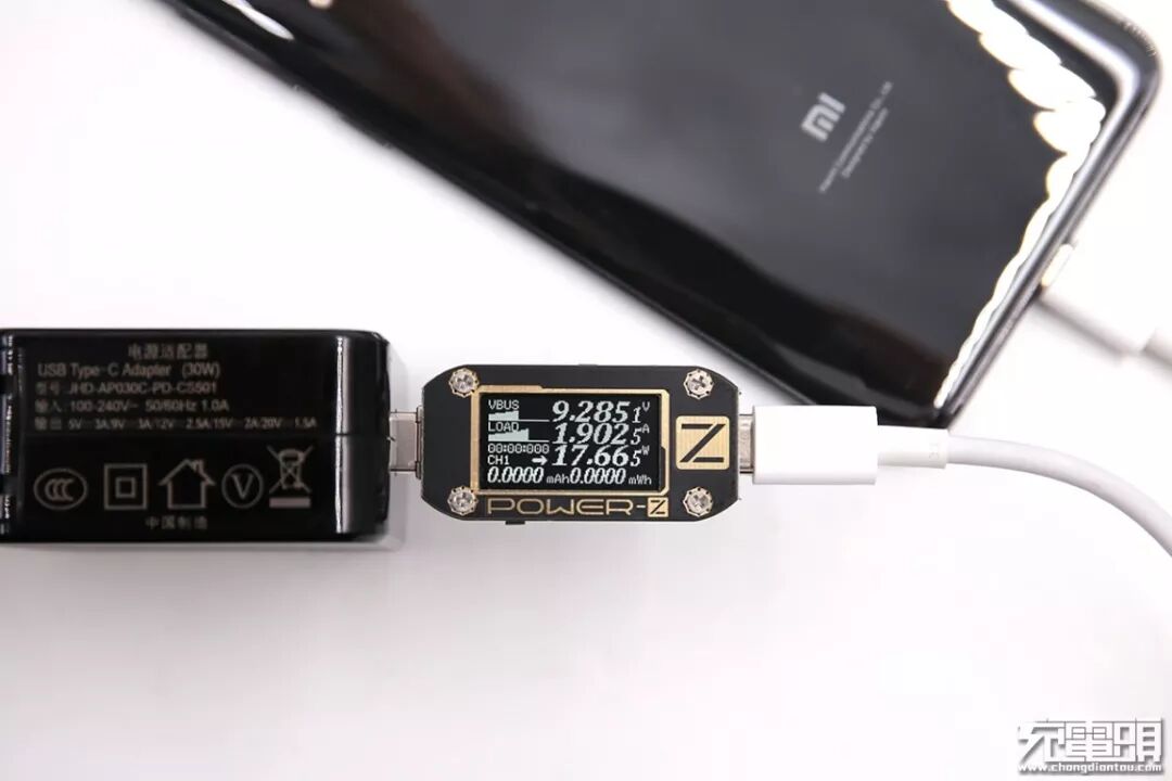 充小米9,电压9.28V,电流1.9A,功率17.66W,开启PD快充。