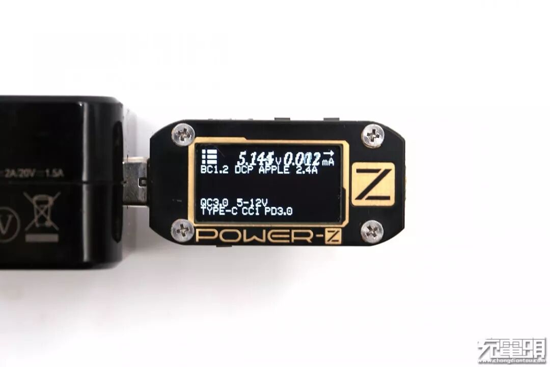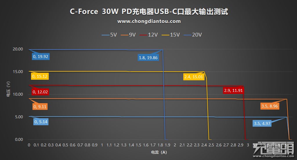 既然支持PD快充,PDO报文那就必不可少。使用 ChargerLAB Power-Z KM001C进行PDO报文显示,也就是输出档位分析,测试得C-FORCE 30W PD充电器支持5V/3A、9V/3A、12V/2.5A、15V/2A、20V/1.5A与充电器外壳上标注一致。