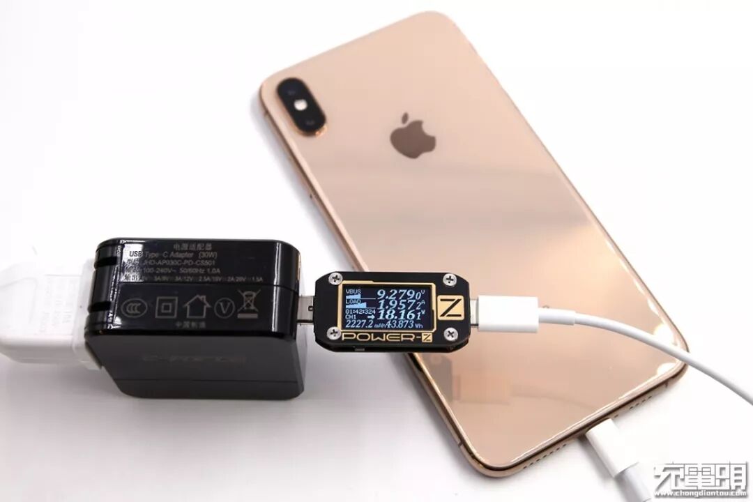 使用C-FORCE 30W PD充电器充iPhone XS Max,电压9.27V,电流1.95A,功率18.16W,开启PD快充。