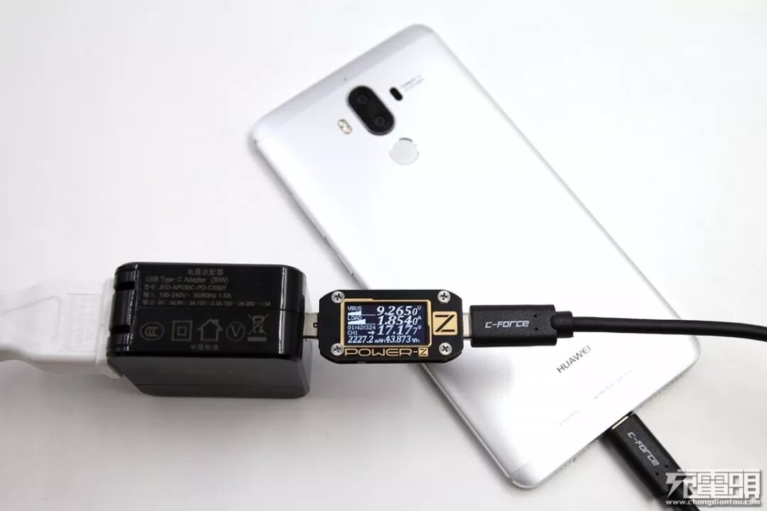 充华为Mate 9手机,电压9.26V,电流1.85A,功率17.17W,开启PD快充。
