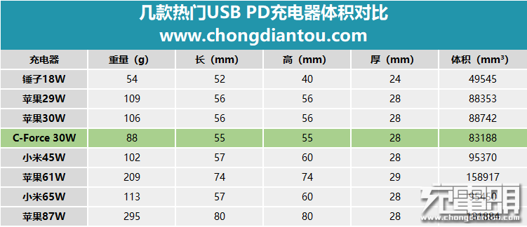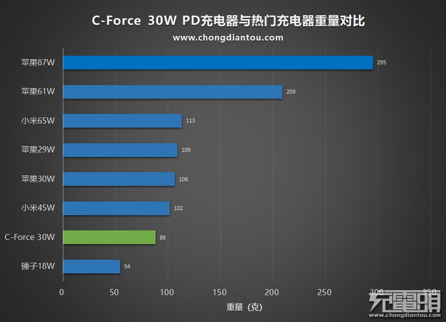 与几款热门PD充电器重量对比柱状图,C-FORCE 30W PD充电器重量较轻。