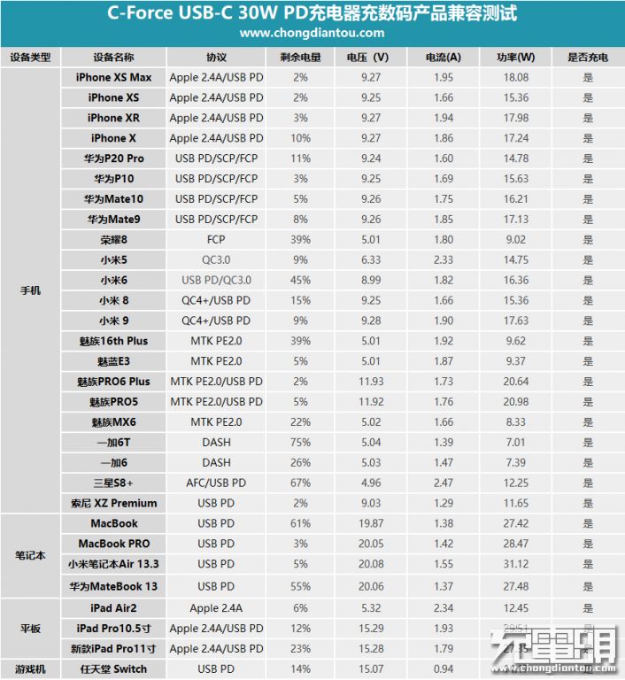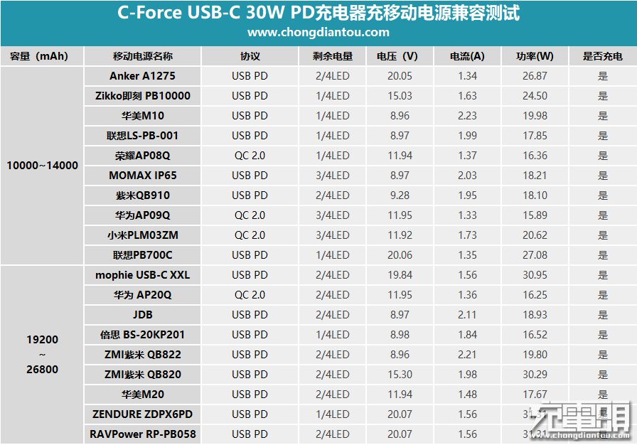 为了方便大家更好的了解这款充电器对于数码产品设备的兼容性情况,小编特意做了一份表格。从表格中可以看出来,这款C-FORCE 30W PD充电器对于数码产品的兼容性非常不错,以上测试的所以设备均能兼容充电,还能给支持PD、QC协议的设备快充,包括Switch游戏掌机、MacBook笔记本等设备(其中三星S8+是以5V PD档位进行快充),接下来我们看下对于移动电源的兼容性情况。