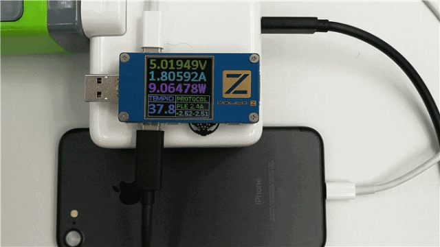 使用苹果USB PD 87W充电器充iPhone7,iPhone7不支持USB PD快充,可以看到iPhone7以5V电压档位正常充电,功率在9W左右,速度比原厂5W快一倍。