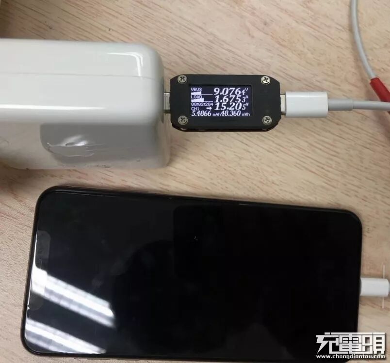 支持USB PD充电的iPhone XS MAX,使用苹果87W PD充电器充电,手机与充电器无线通讯成功后输出9.07V1.67A,充电功率为15.2W。