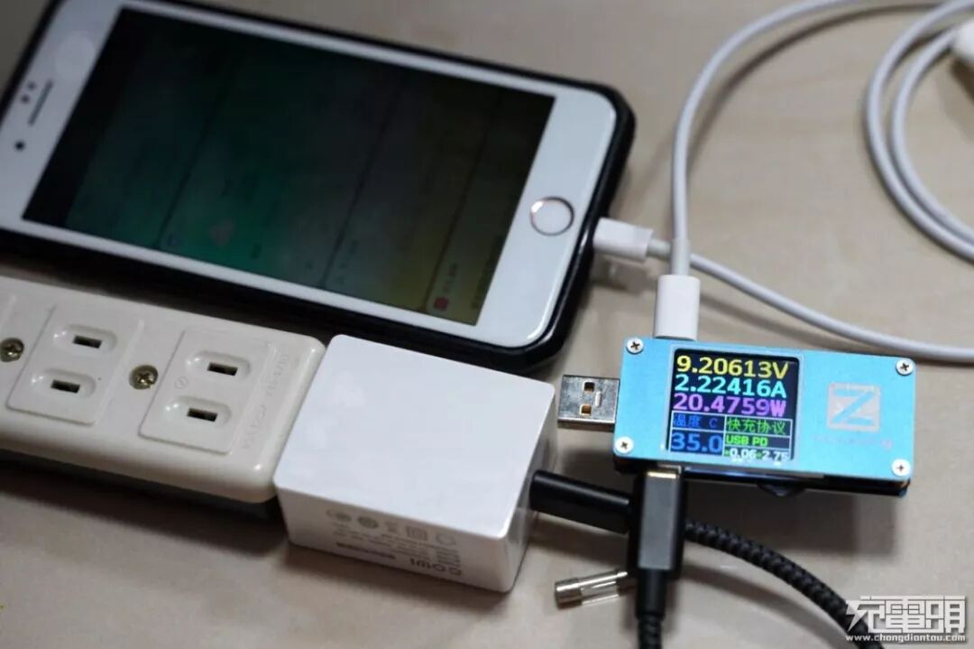 支持USB PD充电的iPhone 8 Plus使用30W USB PD充电器充电,可以看到互相通讯成功后输出9.2V2.2A,充电功率为20W。