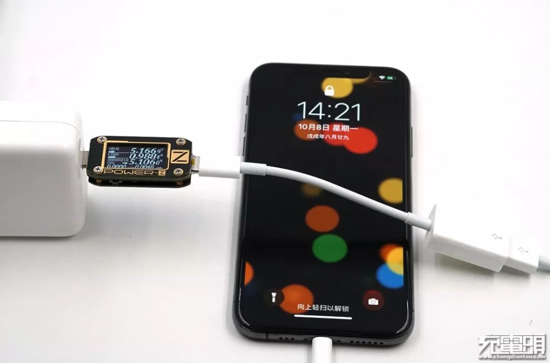 准备好iPhoneXS、转接器和Lightning线后,我们开始测试。测试中使用的苹果30W USB-C充电器。