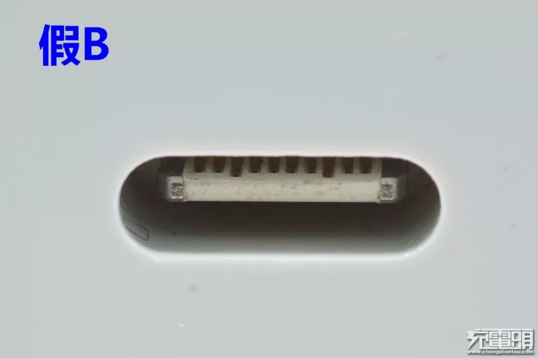 假B充电器的舌片表面虽无明显毛刺,可以看到舌片两侧金属部分物料与真品完全不同,USB-C母座是另外一种款式。