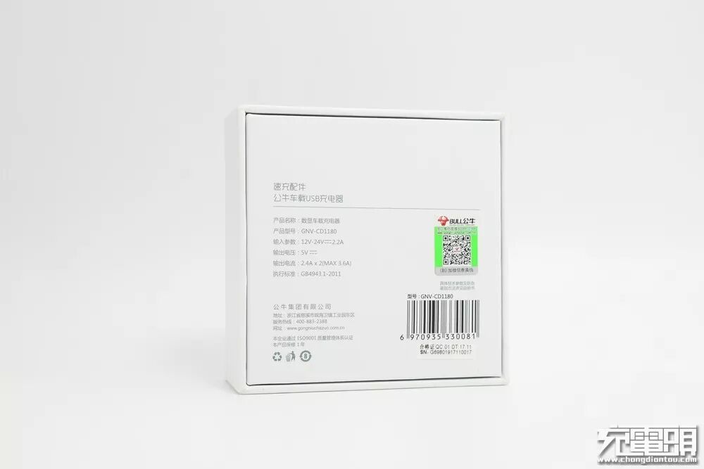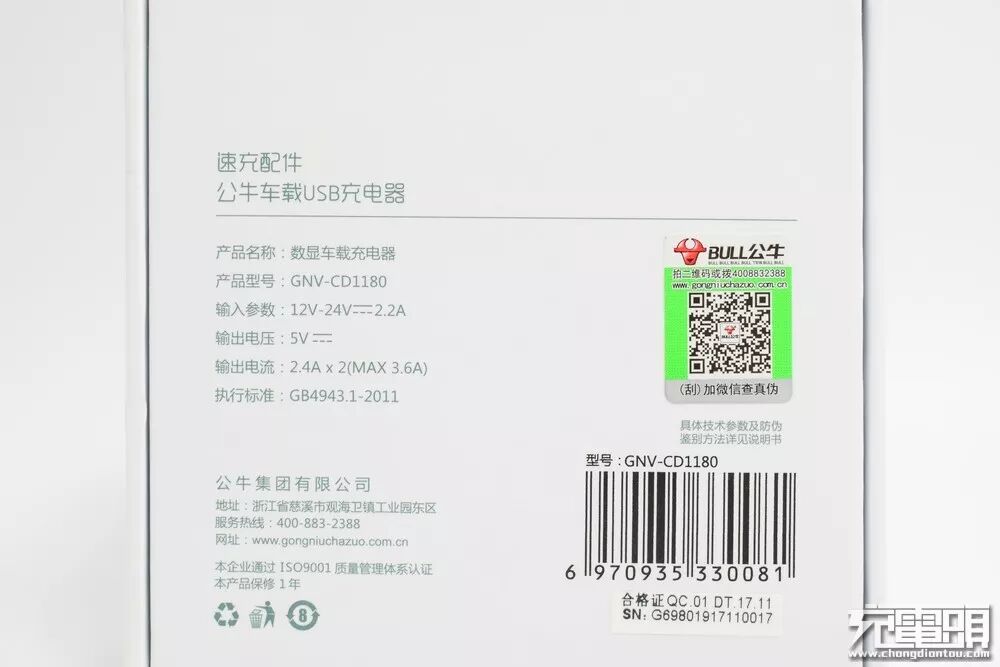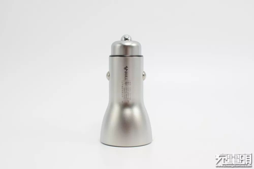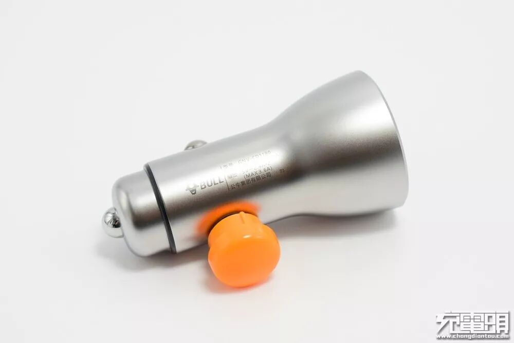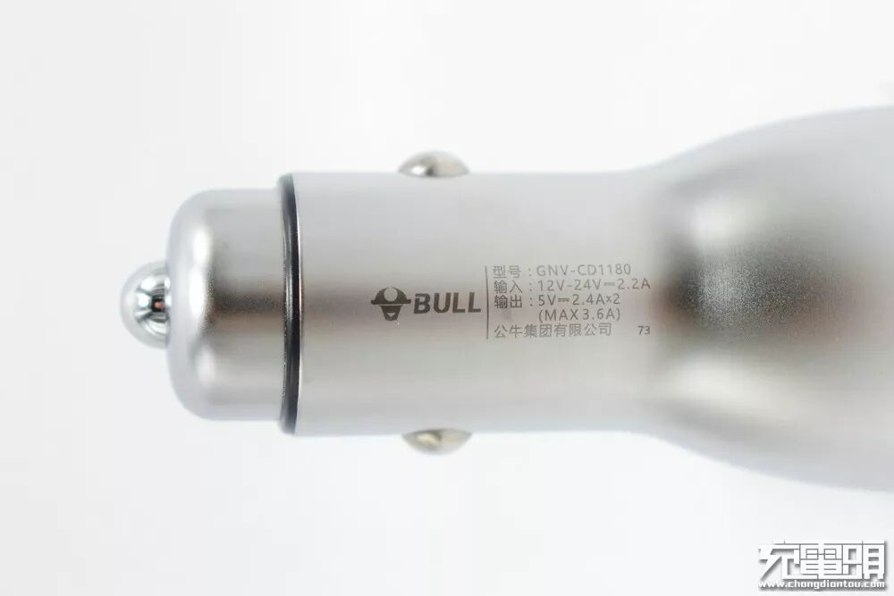 牛头Logo及简要参数镭雕在车充腰身,清晰明了。