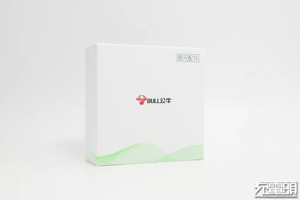 外包装是公牛“速充配件”系列产品标志性的白色纸盒,中央公牛Logo,下方饰以绿色贝塞尔变换线。