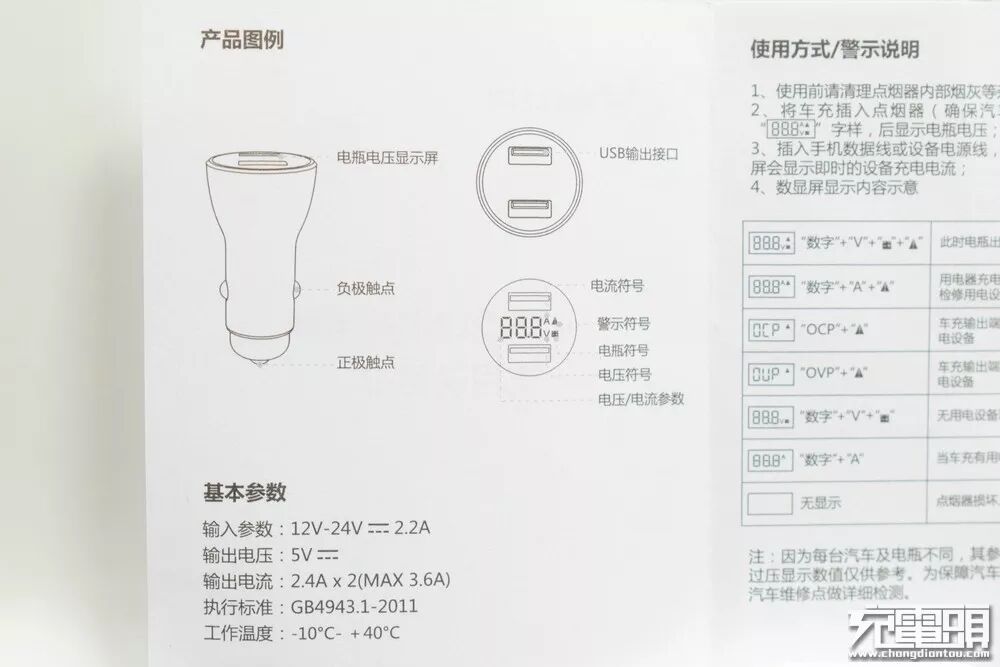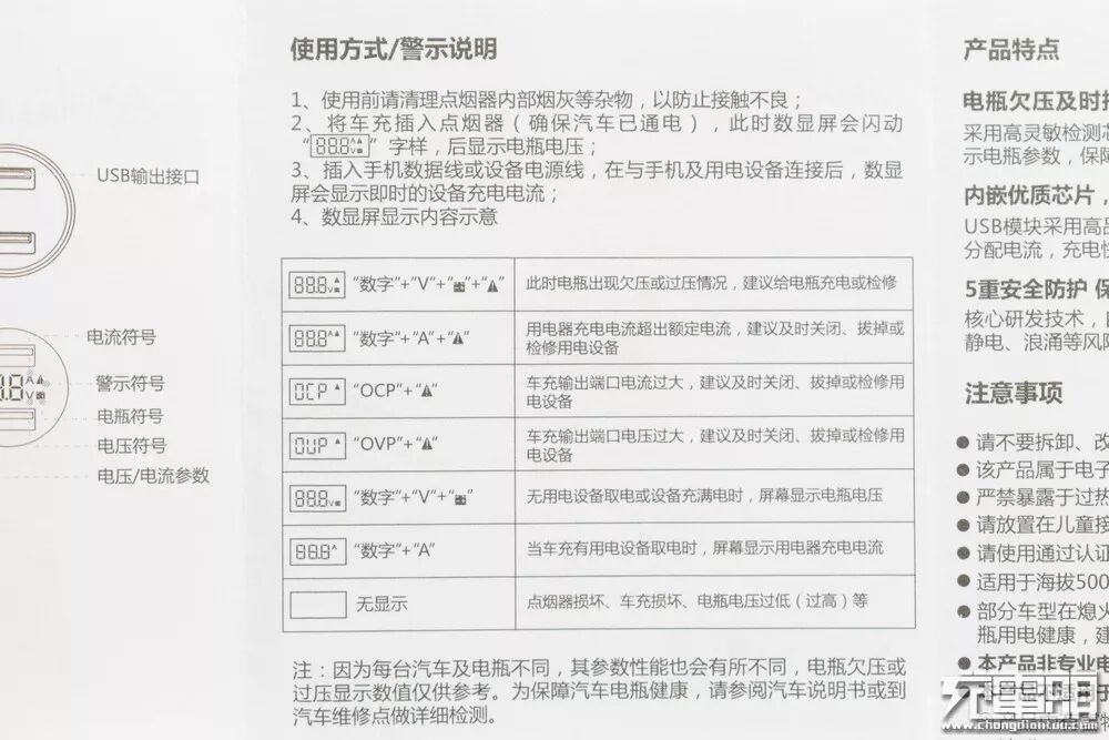 公牛数显车充的电压、电流显示以及告警都是通过输出端面的LED显示屏来完成,说明书里做了十分详细的介绍。