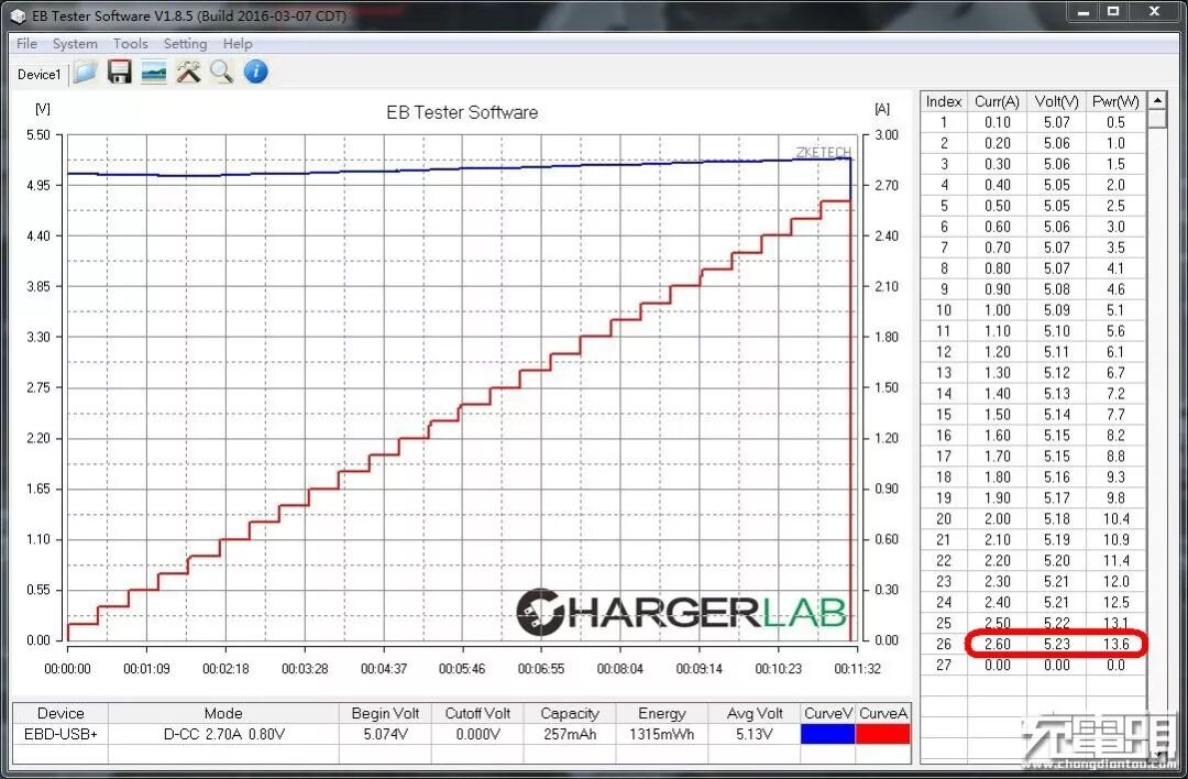 对显示屏上口USB输出性能进行电流步进测试,最大输出为:5.23V/2.60A/13.6W,超过标称的2.4A,在负载电流达到1A左右启动渐进式线补策略。