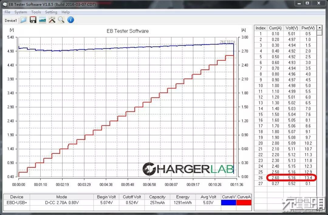对显示屏下口USB输出性能进行电流步进测试,最大输出为:5.16V/2.60A/13.4W,超过标称的2.4A,同样在负载电流达到1A左右启动渐进式线补策略。由于单口测试均超过标称的2.4A但未达到双口最大3.6A值,判断为单口分别限流+总体限流方式。