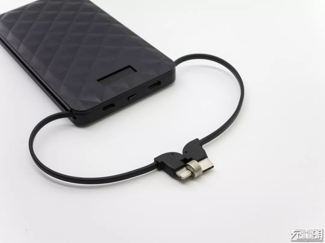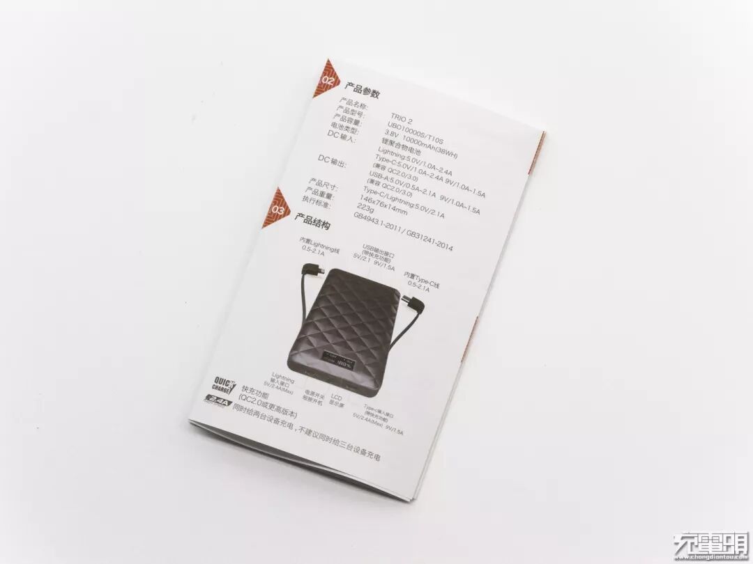 先看一下产品说明书,标注信息相当详细参数略过,看一下产品结构。内置C线和L线,分别用于安卓和苹果设备,其中Type-c接口只做输入接口不支持输出,支持QC协议。