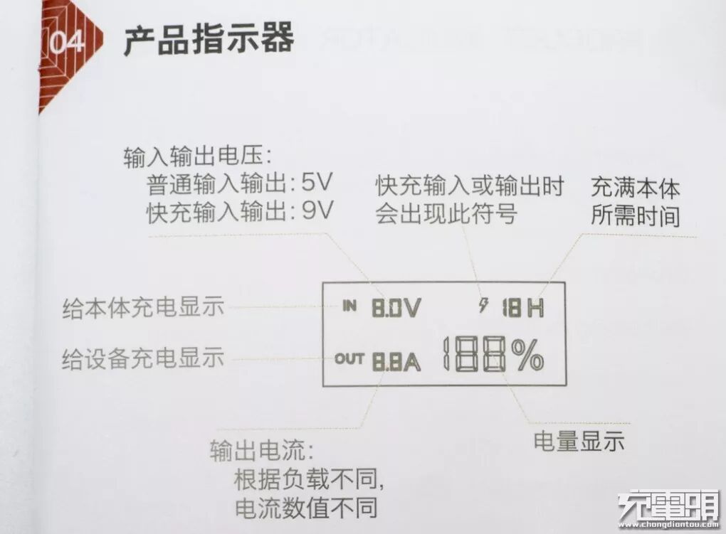 重点讲一下移动电源的显示屏,IN和OUT分别给移动电源充电输入和输出,不同的工作环境会显示特定代码。显示屏上面一行8.0V电压显示,闪电标识快充的工况下会出现,18H充满移动电源的时间,这个也是很特别的地方,移动电源自我评估,在小电流模式显示2H,两小时定时关机。下面一行8.8A电流,188%三位电量显示。