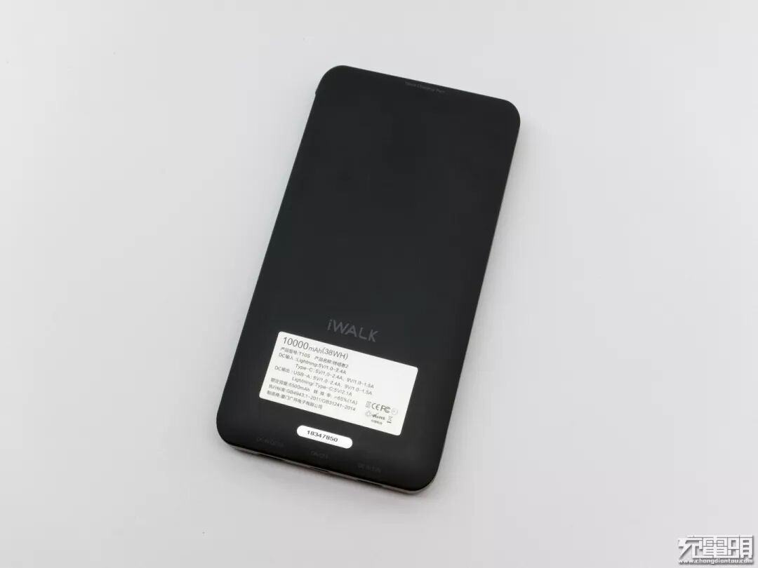 移动电源背面,平面设计边缘略带弧形,手持无咯手感。底部有铭牌信息上方有iWALK的LOGO。